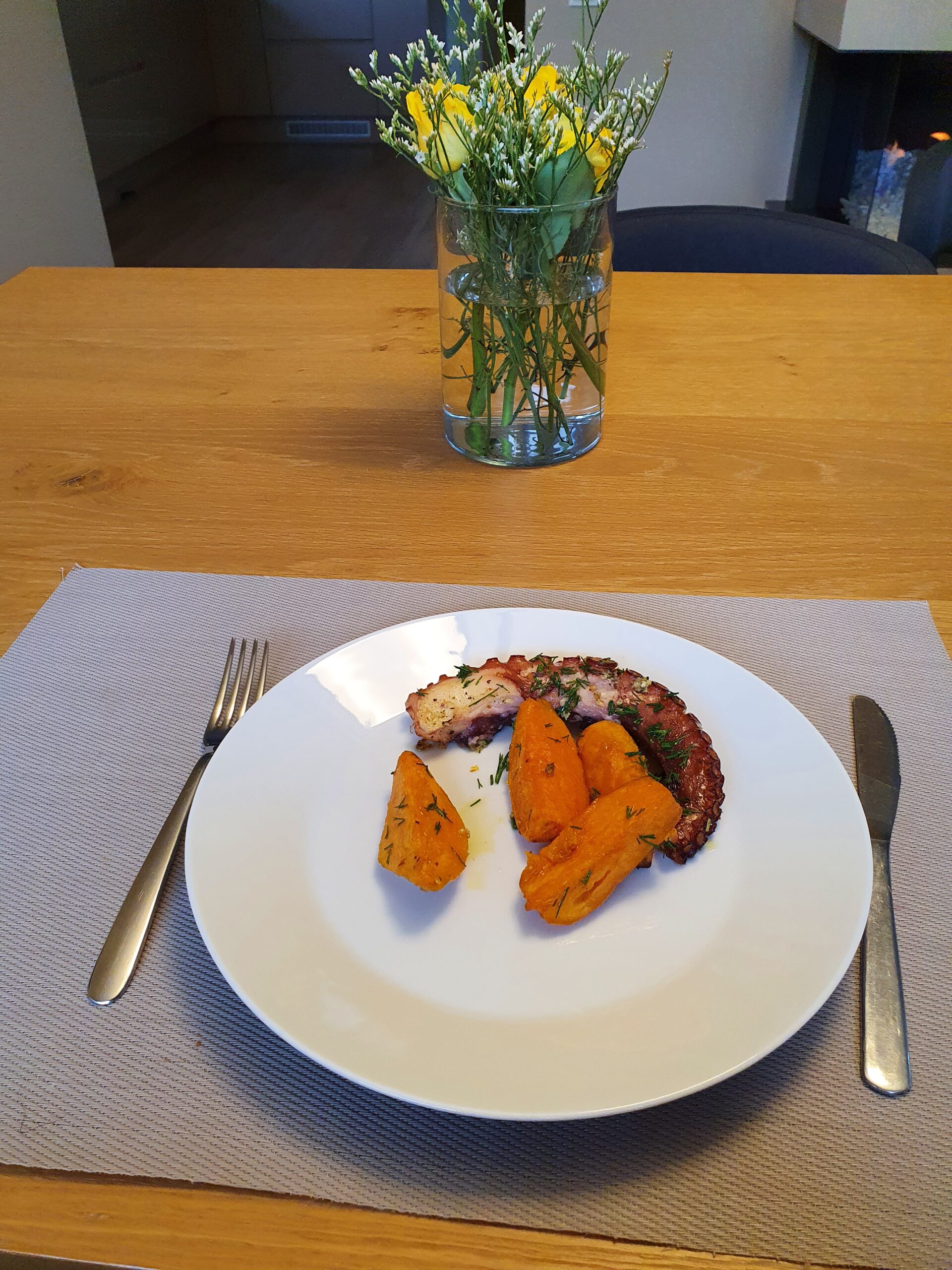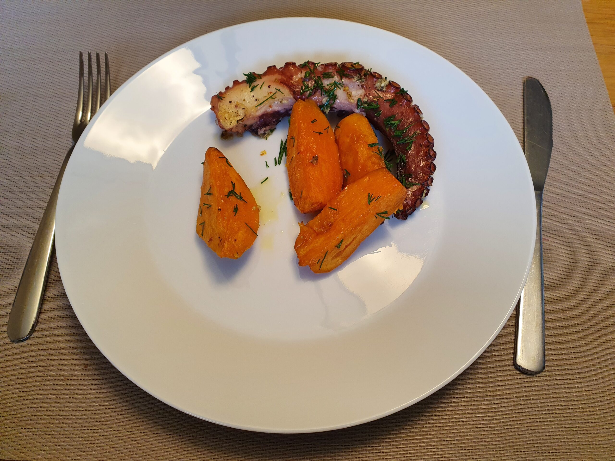 Keptas šviežias aštuonkojis su keptomis orkaitėje batatomis. Valgis nekasdienis. Sakyčiau aristokratiškas. Kartais aštuonkojis patiekiamas su mažomis virtomis bulvytėmis.